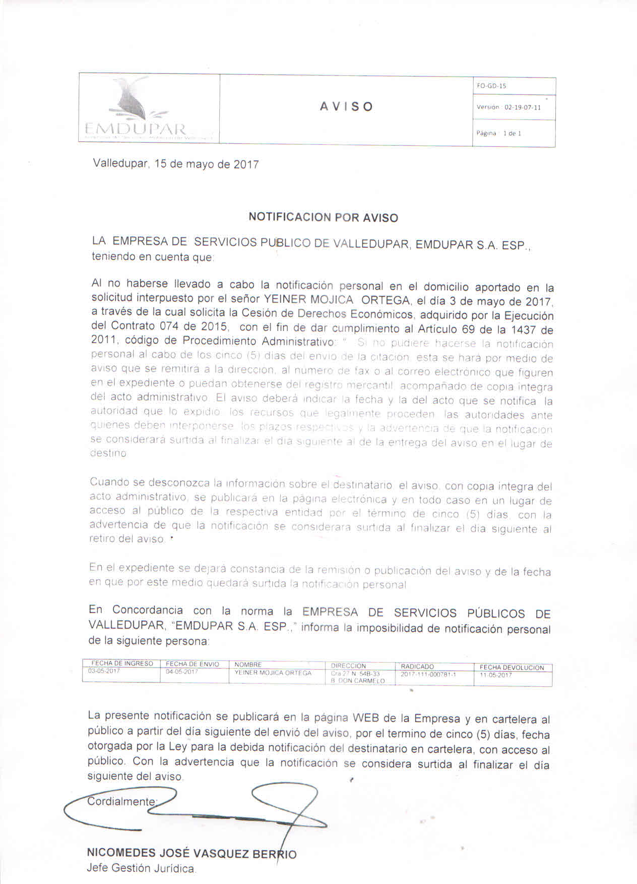 NOTIFICACION POR AVISO DERECHO DE PETICIÓN DE GABRIEL ARRIETA CAMACHO.pdf