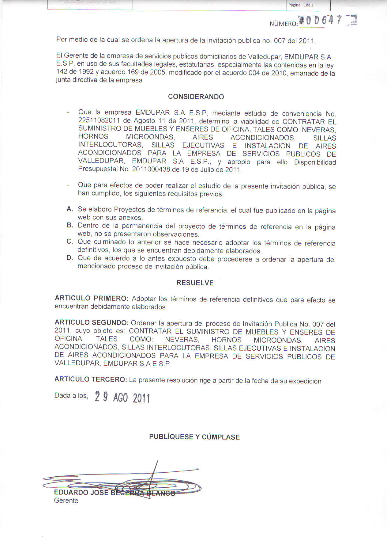 RESOLUCION APERTURA DE LA INVITACION PUBLICA 007 DE 2011.jpg
